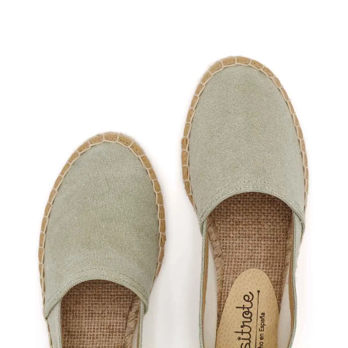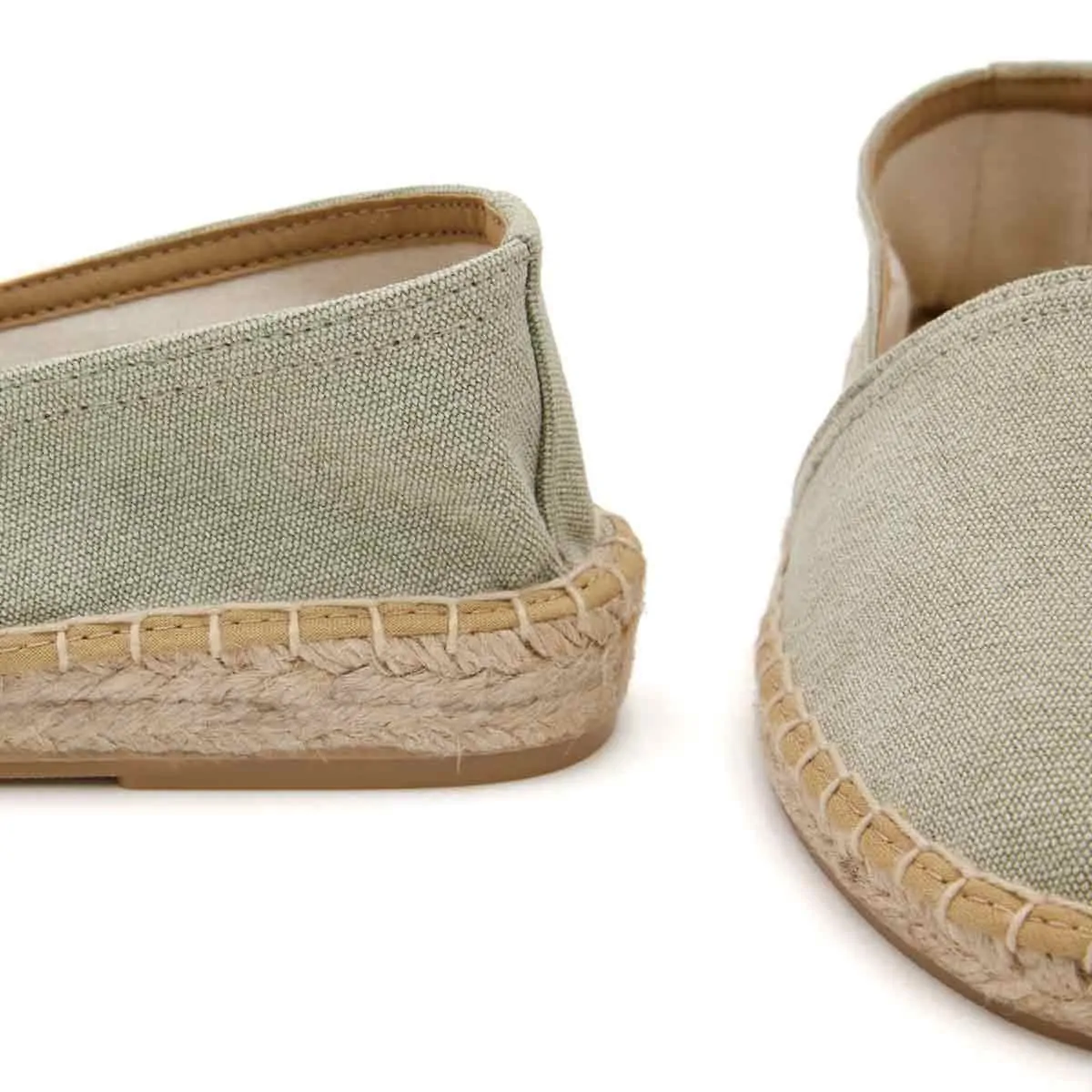 Alpargata clásica elaborada en Lona 100% algodón color Verde Oliva. Cosida a mano y elaborada con productos naturales. Esta Alpargata estilo camping tiene reforzados los bordes del contorno para darle más cuerpo. Forro textil y planta de fibra vegetal sobre suela de yute y piso de goma antideslizante de gran calidad.