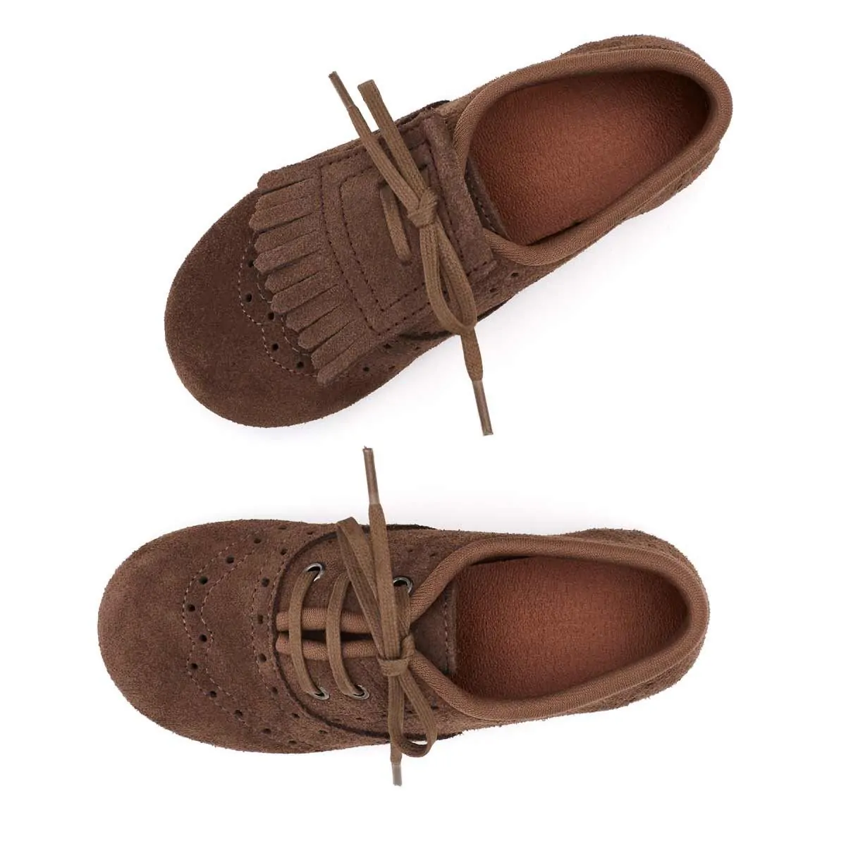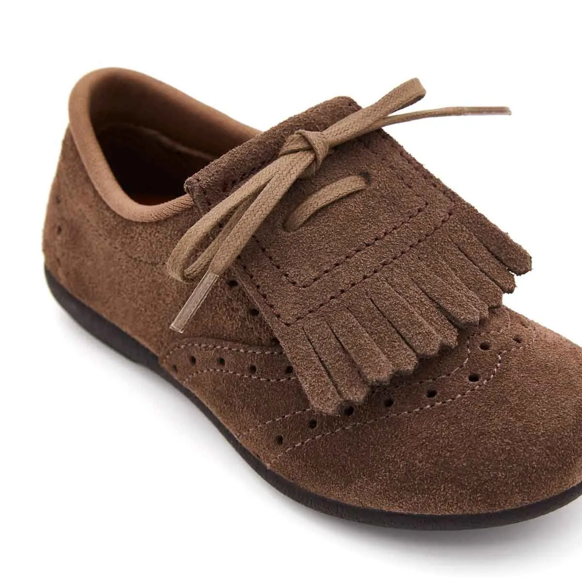 Zapato tipo inglés de Piel Serraje 100% natural y cierre de cordones, sobre el empeine lleva un sencillo detalle de fleco que se puede quitar y poner fácilmente. Con suela de goma muy flexible y antideslizante que junto con sus materiales de la mejor calidad, garantizan una gran comodidad y durabilidad.