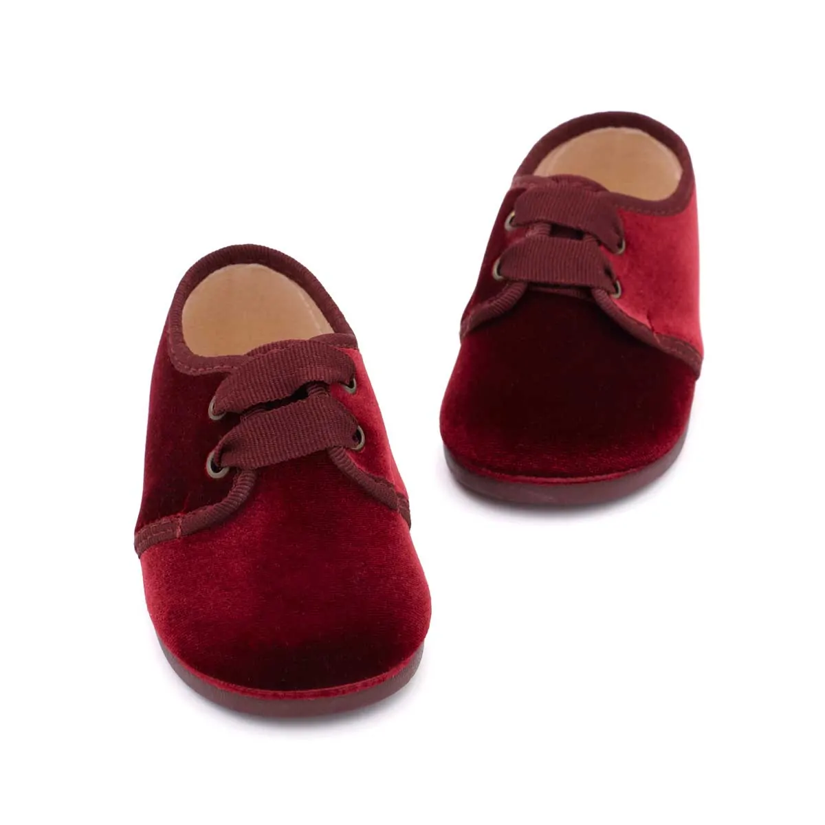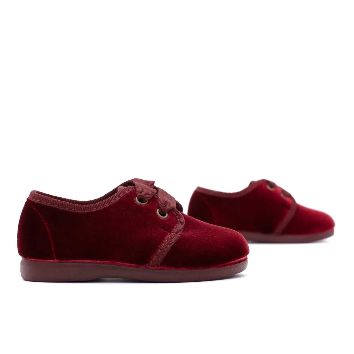 Blucher de terciopelo para niños, de alta calidad con cinta gros grain para ajustarlos correctamente. Con su suela de goma flexible y la plantilla suave, la comodidad y la resistencia están garantizadas. Ideal para complementar los looks de niños de arras.