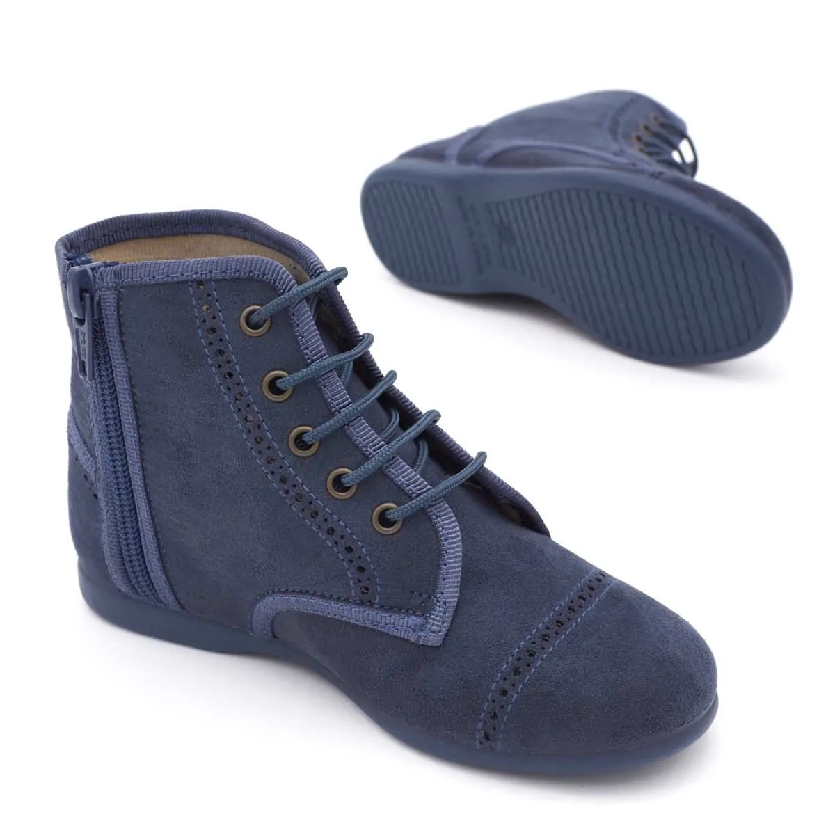 Botín tipo Pascuala para niña elaborado en lona Serratex Azul con fino detalle de picados en la puntera. El cierre de cremallera en el tobillo y cordones les dará a las niñas más autonomía a la hora de calzarse. Resultan muy cómodos para llevar un look de entretiempo.