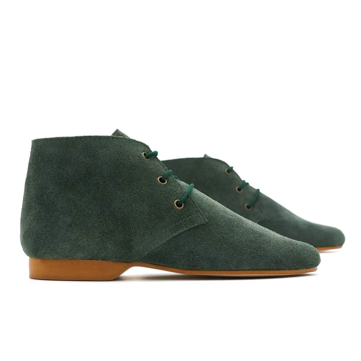 Botín de Piel Serraje 100% natural, color Verde, con cierre de cordón y de corte sencillo y versátil para niñas. Forro y plantilla en Piel natural muy confortable. La suela de goma es flexible y muy resistente.