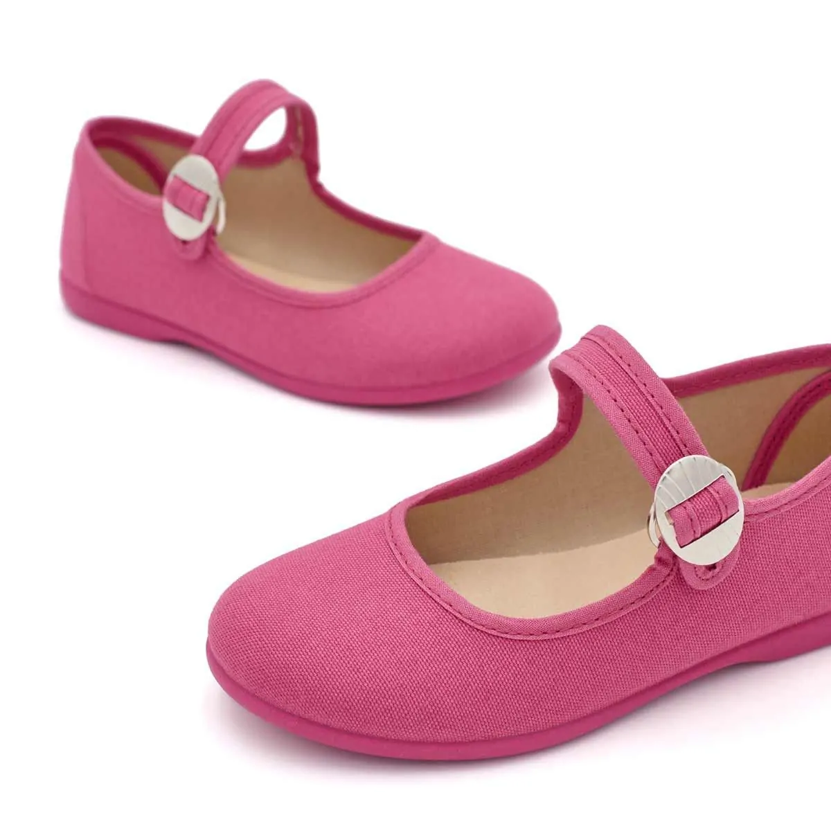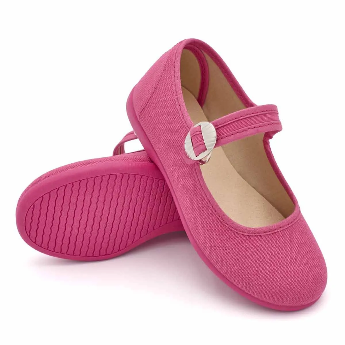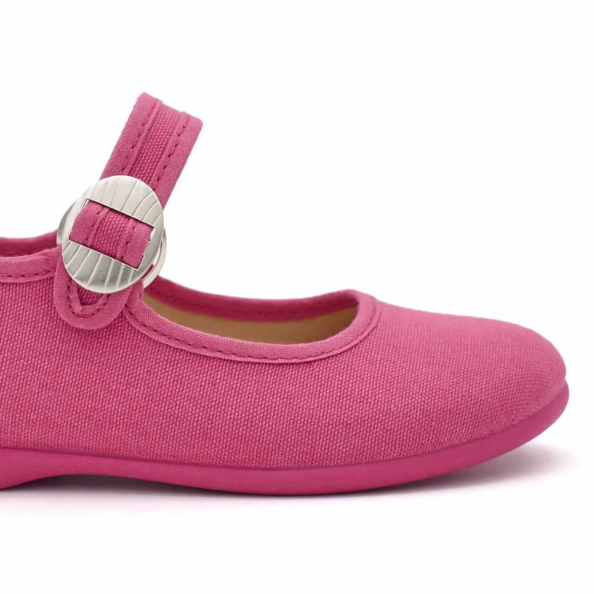 Mercedita color Frambuesa en Lona natural 100% algodón. De corte clásico, con forro y plantilla textil. Cierre con hebilla japonesa movible para ajustarla al pie cómodamente. Suela de goma al tono, antideslizante y muy flexible.