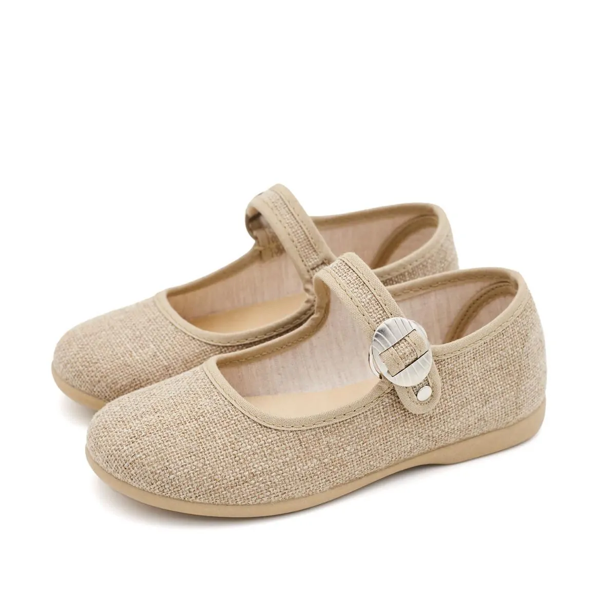 Mercedita de Lino natural para Niña, de corte clásico, con forro y plantilla textil. Cierre con hebilla japonesa movible para ajustarla al pie cómodamente. Suela de goma al tono, antideslizante y muy flexible.