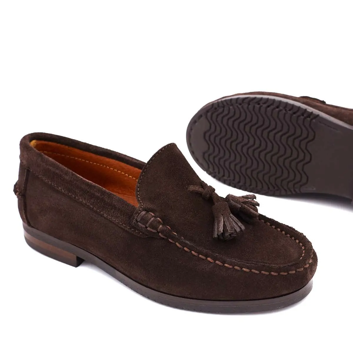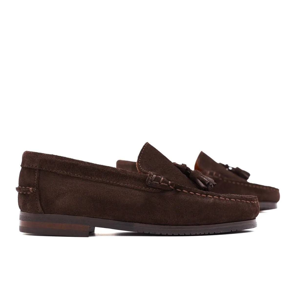 Mocasín clásico, color marrón oscuro, elaborado artesanalmente en Piel Serraje de alta calidad. Rematado con detalle de borlas en el empeine y bordón cosido a mano. Suela de goma antideslizante y flexible para una adecuada amortiguación. Su plantilla acolchada en piel, da el máximo confort y transpiración a los pies.