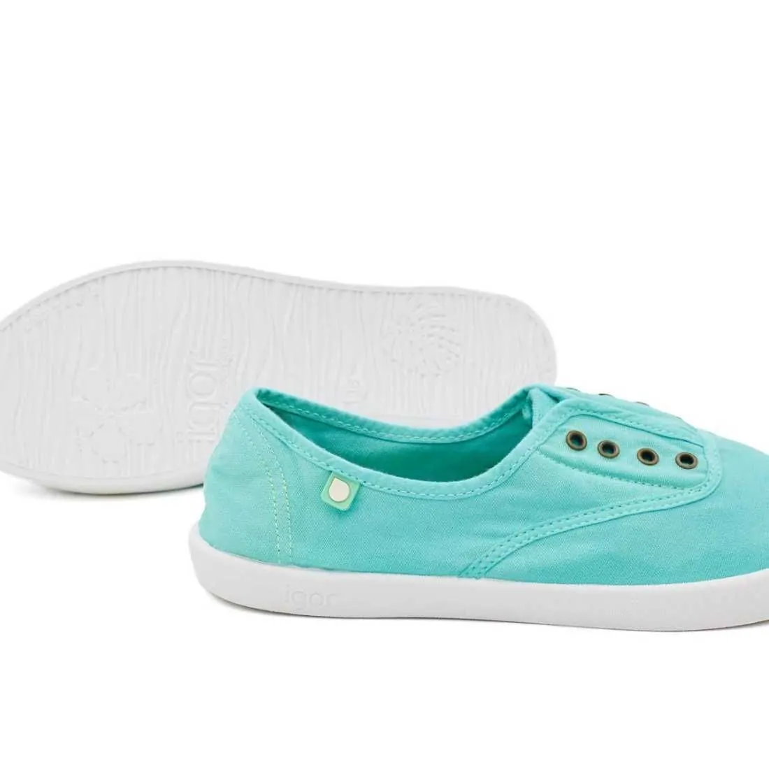 Zapatillas de lona de la marca Igor hechas en 100% algodón color menta, con suela de goma y puntera reforzada también de goma para dar una mejor resistencia y durabilidad, es muy flexible y cómoda. Tiene una plantilla extraíble y acolchada con remates en los bordes para evitar que se deforme.