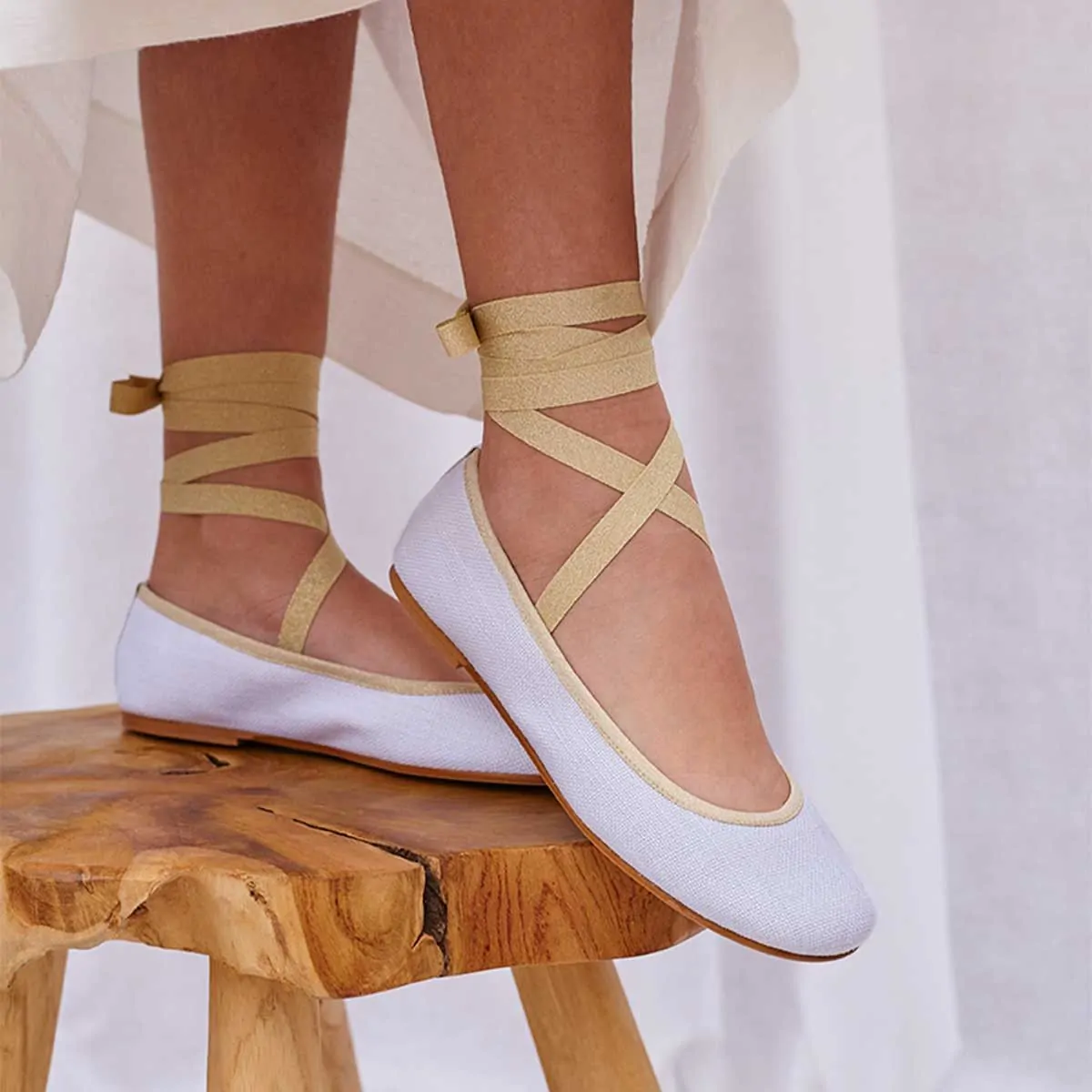 Bailarinas elaboradas en Lino 100% natural de extraordinaria suavidad. Con cintas elásticas color oro, tanto en el ribete como en los lazos, la sujeción está garantizada. Sus cintas se pueden lucir atadas al tobillo o se pueden quitar para llevarlas como unas bailarinas tradicionales. El interior está totalmente forrado en piel y rematado con una plantilla acolchada que permitirá disfrutar de un gran día con total comodidad. La suela de alta calidad es flexible y antideslizante.